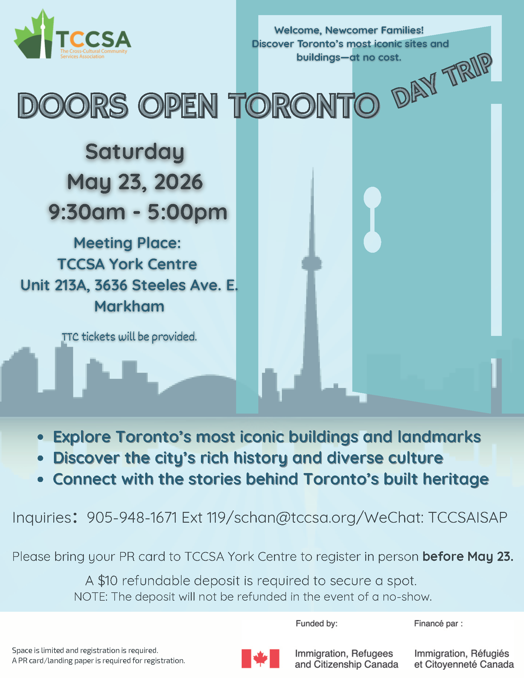 May 23 @ 9:30 am - 5:00 pm Doors Open Toronto Day Trip TCCSA York Centre Metro Square, 3636 Steeles Avenue East, Unit 213A, Markham