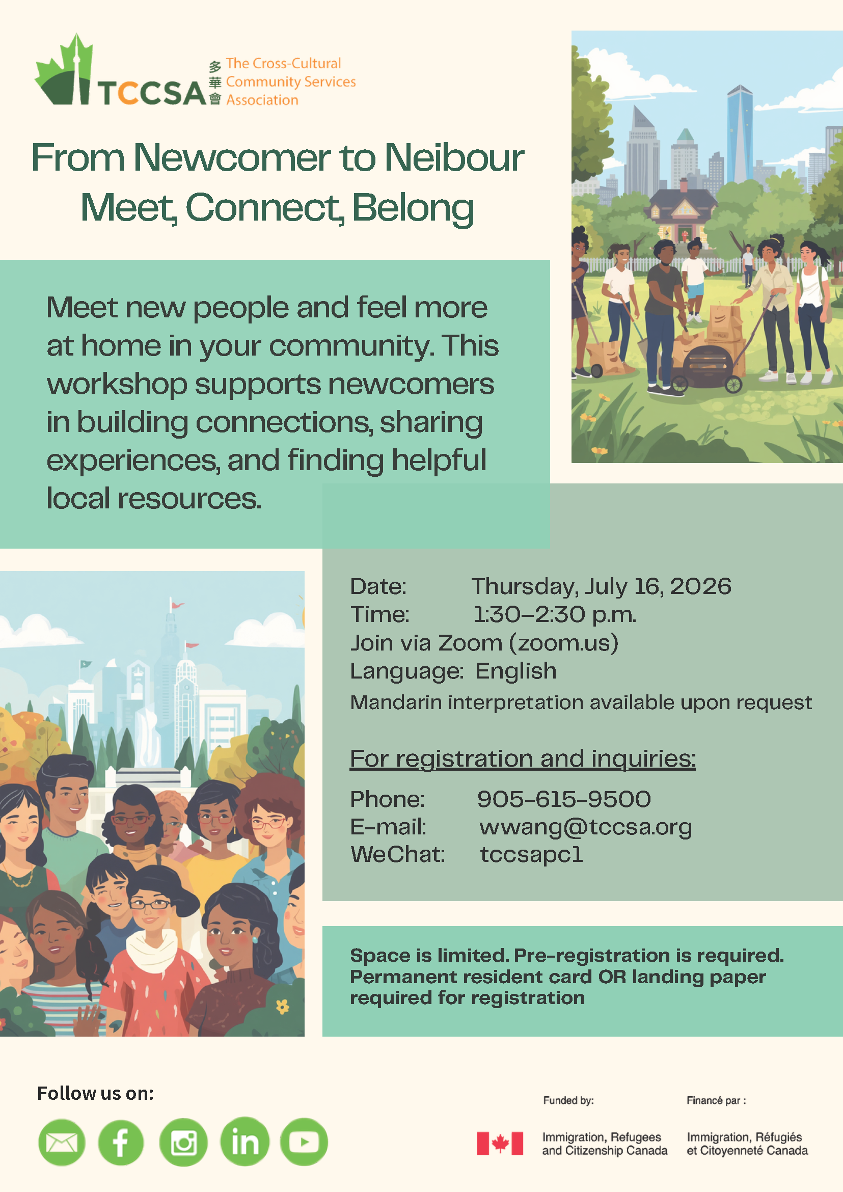 June 25 @ 1:00 pm - 2:30 pm Connect. Create. Belong. Building a Happy Life for Newcomer Seniors TCCSA Peel Centre 720 Burnhamthorpe Road West, Unit 2, Mississauga