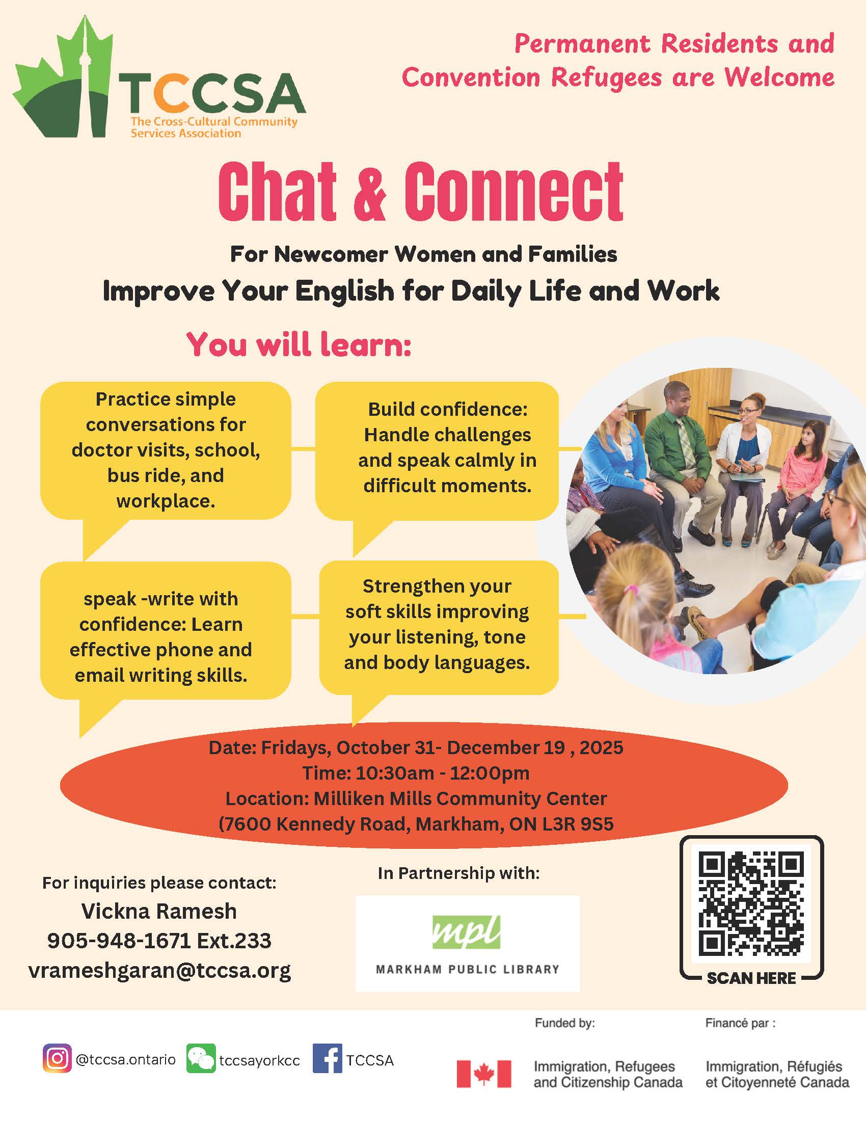 December 12 @ 10:30 am - 12:00 pm Chat & Connect (Fridays, October 31- December 19 , 2025) Miliken Mills Community Centre 7600 Kennedy Road, Markham chat & connect _flyer