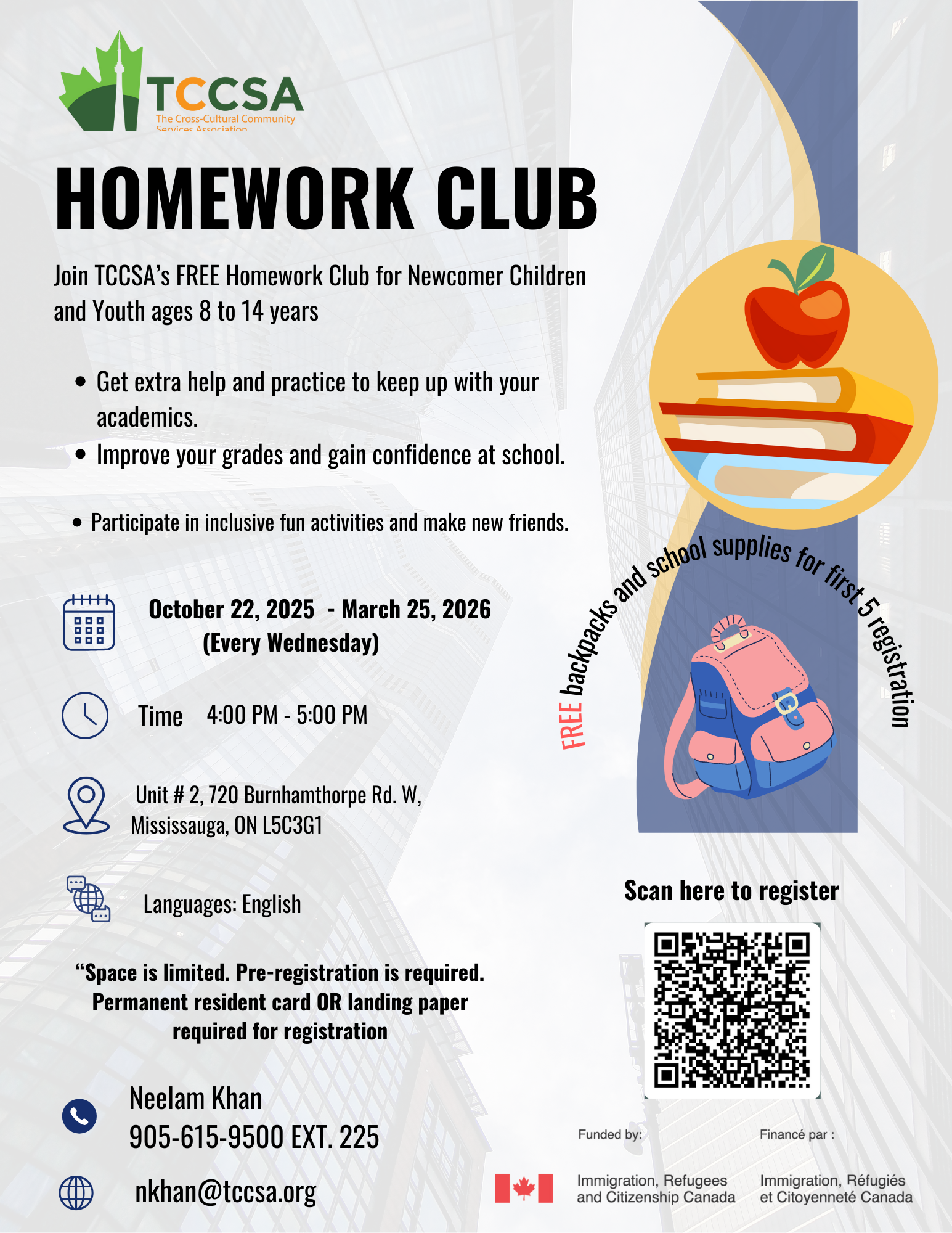 December 31 @ 4:00 pm - 5:00 pm Homework Club – October 22 to March 25, 2026 (Every Wednesday) TCCSA Peel Centre 720 Burnhamthorpe Road West, Unit 2, Mississauga