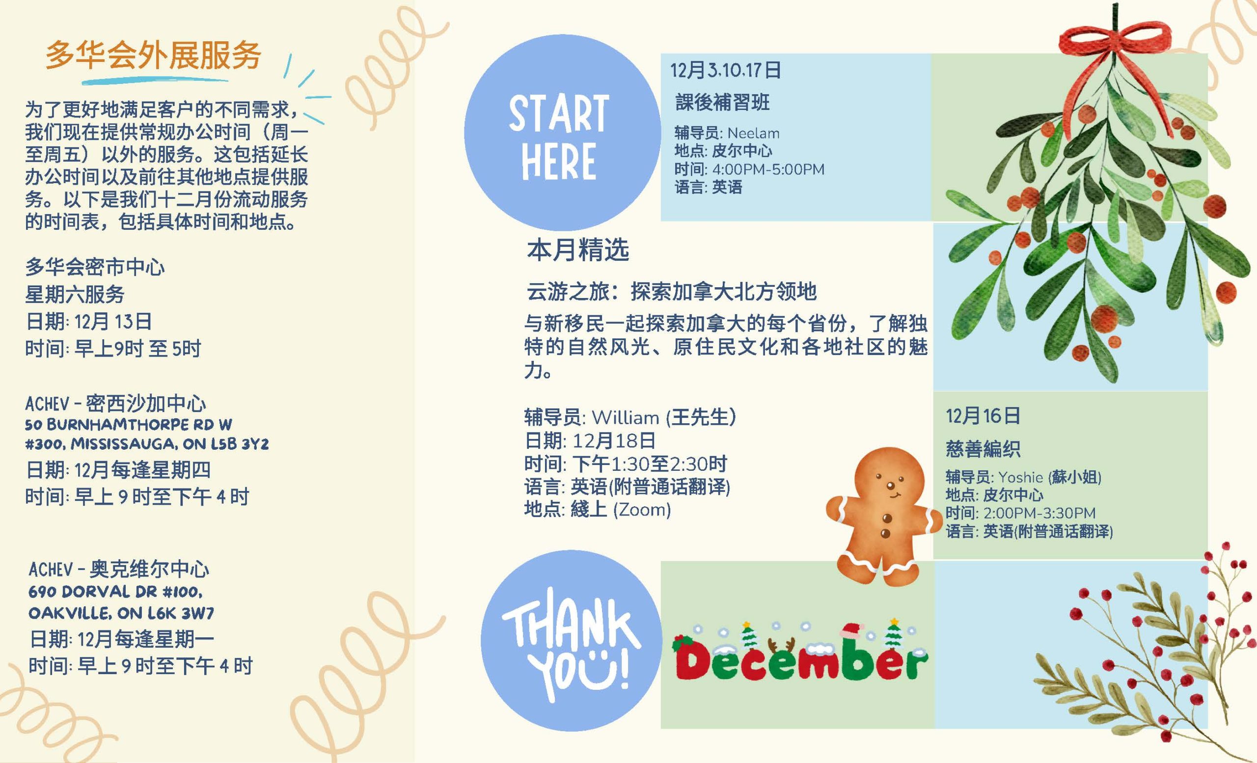 TCCSA Peel Centre – Program Calendar 2025 Click to enlarge the program calendar / 按圖放大活動日曆 December 2025 Peel Centre Upcoming Events: Events Search and Views Navigation Search Enter Keyword. Search for Events by Keyword. Find Events Event Views Navigation List List Month Photo Today Now Now - 1/14/2026 January 14, 2026 Select date. November 2025 Fri 28 Featured November 1 - November 30 TCCSA Peel Centre – November Program Calendar 2025 TCCSA Peel Centre 720 Burnhamthorpe Road West, Unit 2, Mississauga December 2025 Wed 3 December 3 @ 4:00 pm - 5:00 pm Homework Club – October 22 to March 25, 2026 (Every Wednesday) TCCSA Peel Centre 720 Burnhamthorpe Road West, Unit 2, Mississauga Wed 10 December 10 @ 4:00 pm - 5:00 pm Homework Club – October 22 to March 25, 2026 (Every Wednesday) TCCSA Peel Centre 720 Burnhamthorpe Road West, Unit 2, Mississauga Tue 16 December 16 @ 2:00 am - 3:30 pm Women’s Group-Knitting for Charity Wed 17 December 17 @ 4:00 pm - 5:00 pm Homework Club – October 22 to March 25, 2026 (Every Wednesday) TCCSA Peel Centre 720 Burnhamthorpe Road West, Unit 2, Mississauga Thu 18 December 18 @ 1:30 pm - 2:30 pm A Virtual Journey to Canada’s Northern Territories Online Wed 24 December 24 @ 4:00 pm - 5:00 pm Homework Club – October 22 to March 25, 2026 (Every Wednesday) TCCSA Peel Centre 720 Burnhamthorpe Road West, Unit 2, Mississauga Wed 31 December 31 @ 4:00 pm - 5:00 pm Homework Club – October 22 to March 25, 2026 (Every Wednesday) TCCSA Peel Centre 720 Burnhamthorpe Road West, Unit 2, Mississauga January 2026 Wed 7 January 7, 2026 @ 4:00 pm - 5:00 pm Homework Club – October 22 to March 25, 2026 (Every Wednesday) TCCSA Peel Centre 720 Burnhamthorpe Road West, Unit 2, Mississauga Wed 14 January 14, 2026 @ 4:00 pm - 5:00 pm Homework Club – October 22 to March 25, 2026 (Every Wednesday) TCCSA Peel Centre 720 Burnhamthorpe Road West, Unit 2, Mississauga Previous Events Today Next Events Export Events