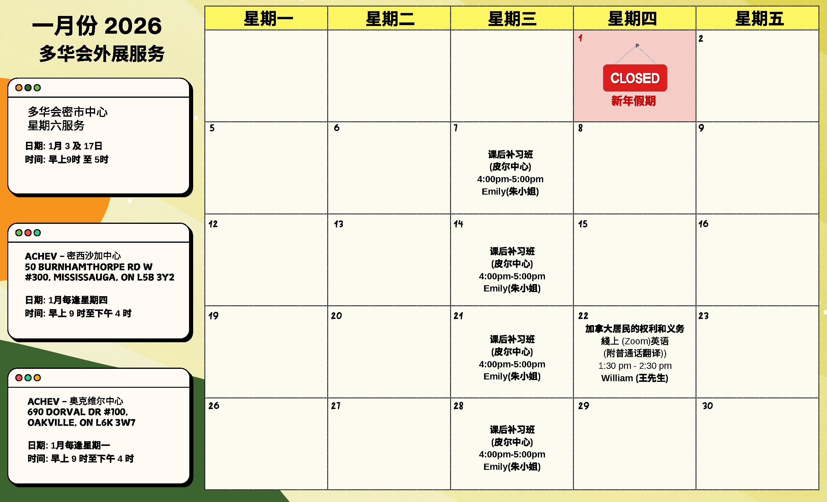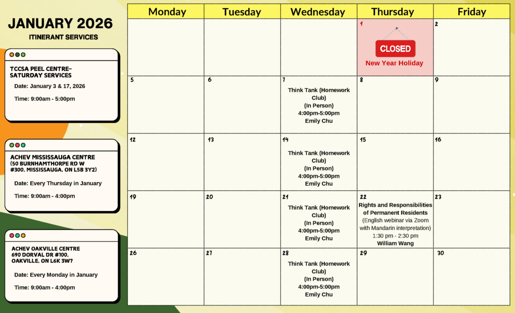 TCCSA Peel Centre – Program Calendar 2026