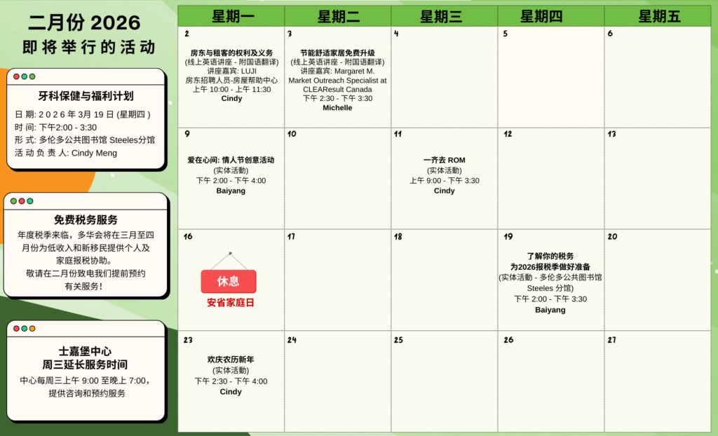 Featured February 1 - February 28 Scarborough Centre – February Program Calendar 2026 TCCSA Scarborough Centre 325 Bamburgh Circle, Unit A107, Toronto