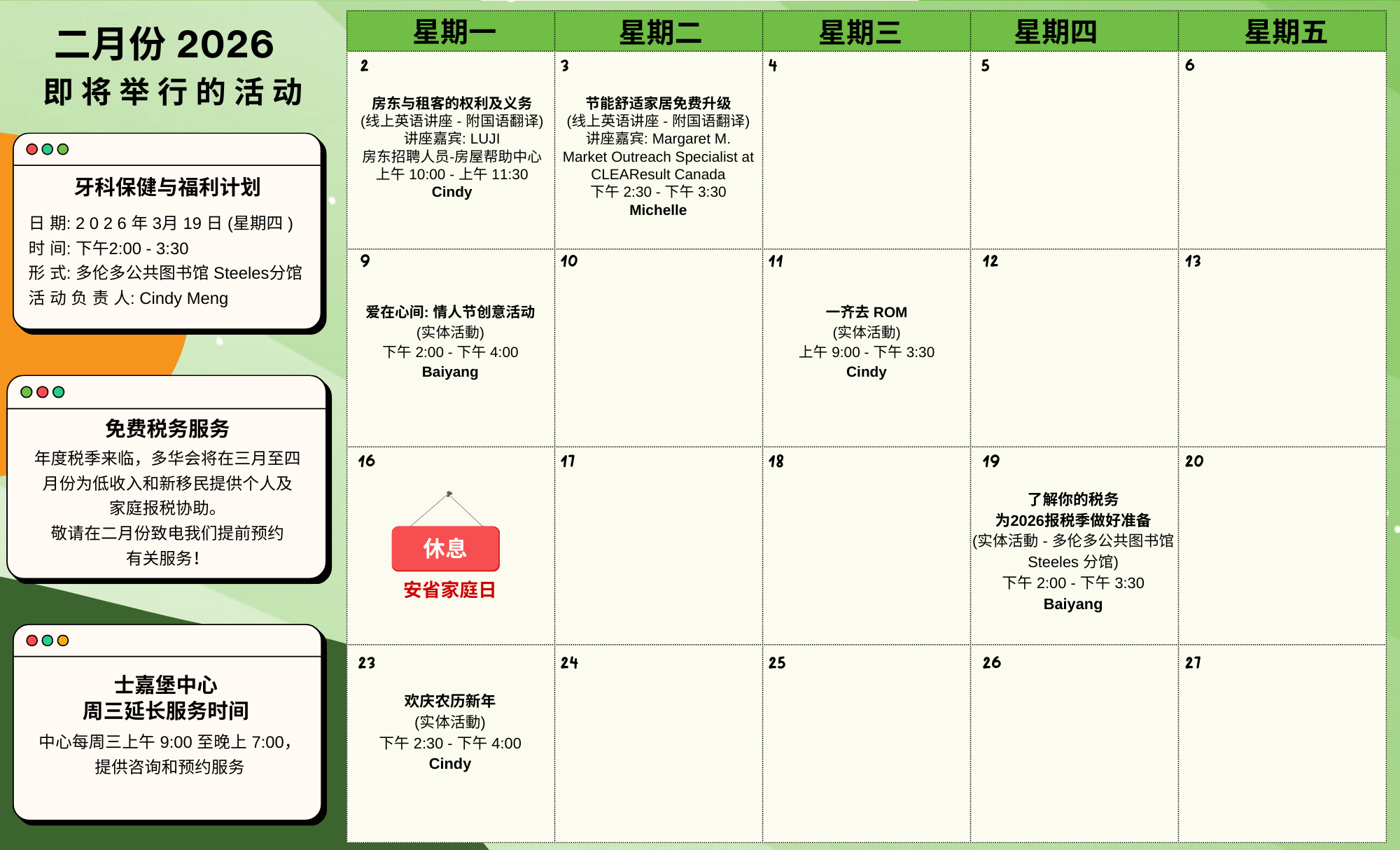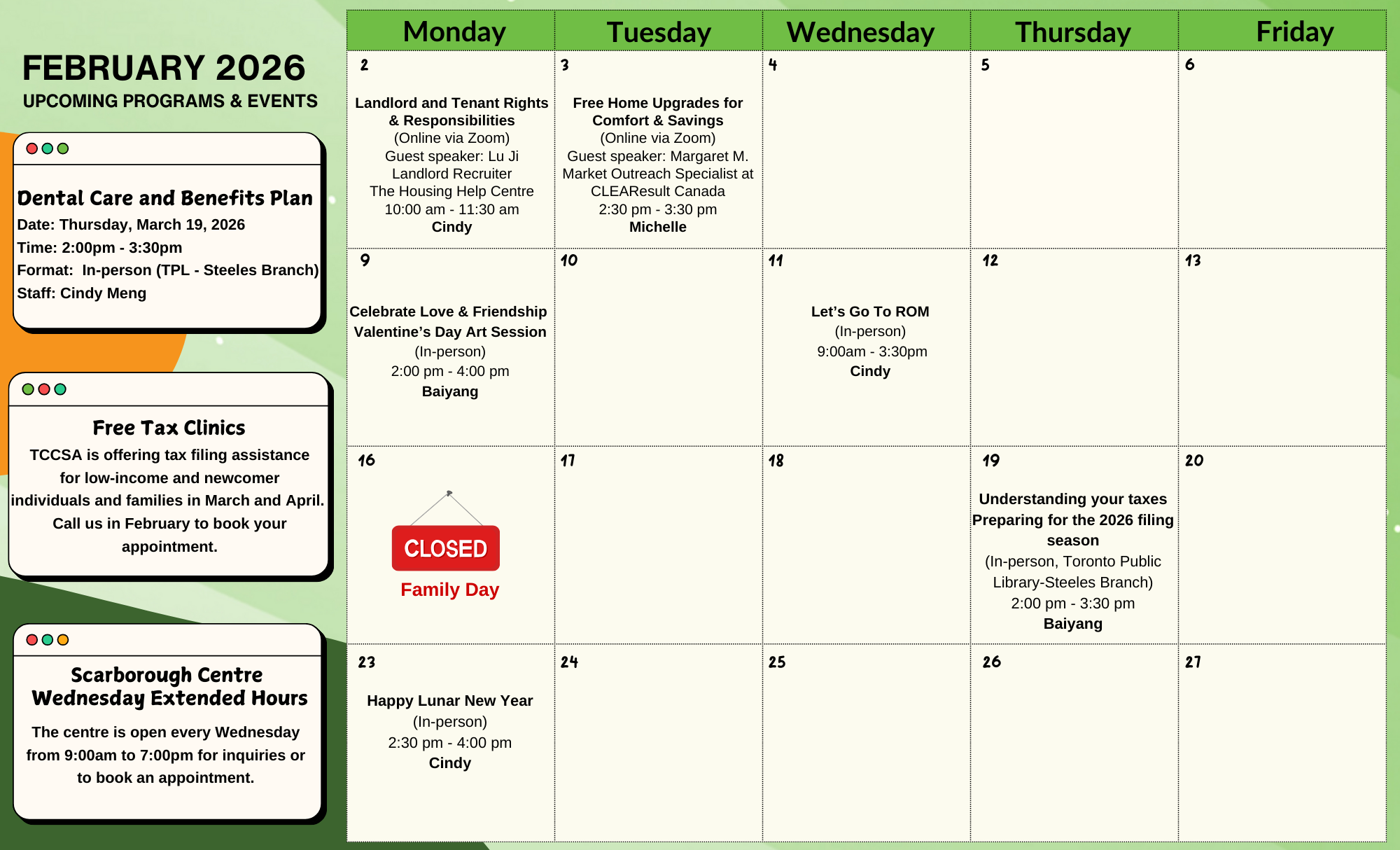 TCCSA Scarborough Centre – Program Calendar 2026 Click to enlarge the program calendar / 按圖放大課程日曆 February 2026 Scarborough Centre Upcoming Events: Events Search and Views Navigation Search Enter Keyword. Search for Events by Keyword. Find Events Event Views Navigation List List Month Photo Today Now Now - 3/19/2026 March 19 Select date. February 2026 Sat 14 Featured February 1 - February 28 Scarborough Centre – February Program Calendar 2026 TCCSA Scarborough Centre 325 Bamburgh Circle, Unit A107, Toronto Thu 19 February 19 @ 2:00 pm - 3:30 pm Understanding Your Taxes – Preparing For The 2026 Filing Season Steeles Library 375 Bamburgh Cir, C107, Scarborough Mon 23 February 23 @ 2:30 pm - 4:00 pm Happy Lunar New Year TCCSA Scarborough Centre 325 Bamburgh Circle, Unit A107, Toronto March 2026 Wed 4 Featured March 4 @ 9:30 am - 4:30 pm Free Tax Filing Services for Low-income Newcomers TCCSA Scarborough Centre 325 Bamburgh Circle, Unit A107, Toronto Wed 4 March 4 @ 9:30 am - 4:30 pm Free Tax Clinic for Seniors with Low Income TCCSA Scarborough Centre 325 Bamburgh Circle, Unit A107, Toronto Wed 11 Featured March 11 @ 9:30 am - 4:30 pm Free Tax Filing Services for Low-income Newcomers TCCSA Scarborough Centre 325 Bamburgh Circle, Unit A107, Toronto Wed 11 March 11 @ 9:30 am - 4:30 pm Free Tax Clinic for Seniors with Low Income TCCSA Scarborough Centre 325 Bamburgh Circle, Unit A107, Toronto Wed 18 Featured March 18 @ 9:30 am - 4:30 pm Free Tax Filing Services for Low-income Newcomers TCCSA Scarborough Centre 325 Bamburgh Circle, Unit A107, Toronto Wed 18 March 18 @ 9:30 am - 4:30 pm Free Tax Clinic for Seniors with Low Income TCCSA Scarborough Centre 325 Bamburgh Circle, Unit A107, Toronto Thu 19 March 19 @ 2:00 pm - 3:30 pm Dental Care and Benefits Plan Steeles Library 375 Bamburgh Cir, C107, Scarborough Previous Events Today Next Events Export Events