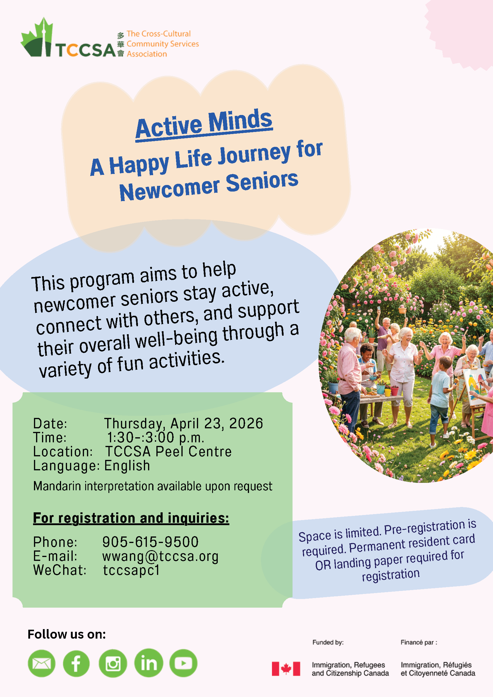 April 2 @ 1:30 pm - 3:00 pm Active Minds – A Happy Life Journey for Newcomer Seniors (April 2, 2026) TCCSA Peel Centre 720 Burnhamthorpe Road West, Unit 2, Mississauga
